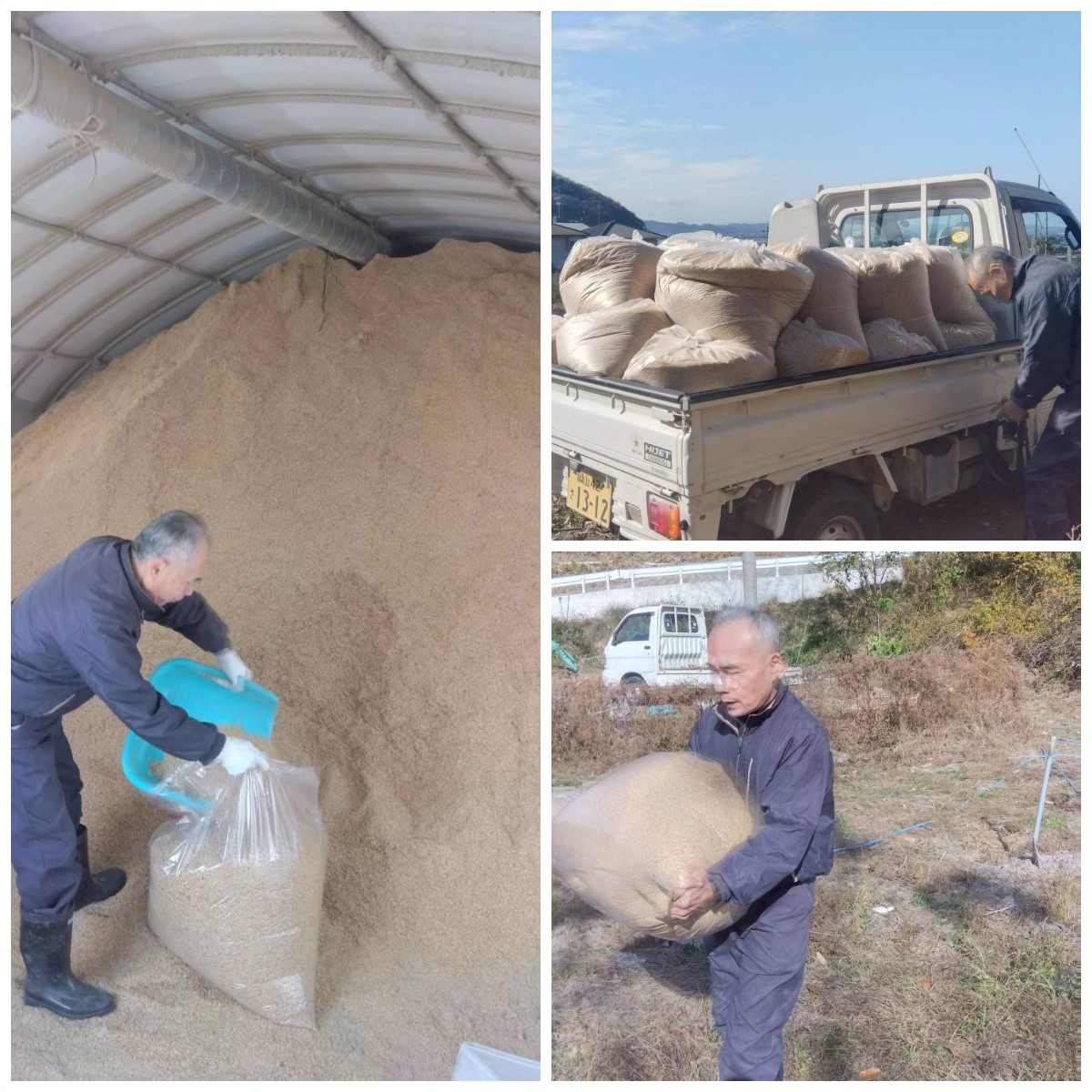 本日は、菜園の冬支度のために、協力者の農家さんから、もみ殻を頂けるとのことで、軽トラで伺いました。