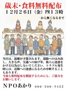 ★配布開始前や、待ち時間は、静かにお待ちください。近隣の迷惑になると、残念ですが無料配布が中止になることもあります。